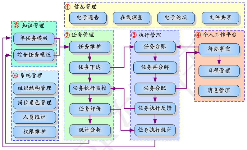 系統(tǒng)基本功能劃分為信息管理、任務管理、執(zhí)行管理、個人工作平臺、知識管理、系統(tǒng)管理六大模塊。