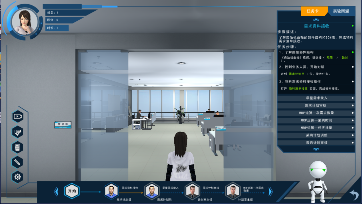 將企業(yè)管理業(yè)務(wù)流程的三條主線:物流主線、生產(chǎn)主線和成本主線融入實(shí)驗(yàn)過程,通過企業(yè)3D實(shí)景,以崗位角色扮演形成虛擬實(shí)驗(yàn)場景,將數(shù)據(jù)可視化地嵌入場景,為角色互動和流程流轉(zhuǎn)增加游戲效果,建立全新的實(shí)驗(yàn)課程教學(xué)模式。