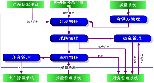 科研物資管理系統(tǒng)圍繞物資需求規(guī)劃、采購(gòu)計(jì)劃編制、采購(gòu)管理、庫(kù)存管理和資金管理進(jìn)行動(dòng)態(tài)控制,同時(shí)結(jié)合科研院所管理現(xiàn)狀,考慮事前控制和事后分析相結(jié)合,進(jìn)行輔助決策。通過(guò)對(duì)物資屬性參數(shù)的預(yù)先設(shè)置,能夠?qū)?kù)存異常進(jìn)行報(bào)警,對(duì)需要庫(kù)位及批號(hào)管理的物資進(jìn)行庫(kù)位及批號(hào)管理,進(jìn)而真正提高庫(kù)存管理水平,降低庫(kù)存資金占用;能夠?qū)崟r(shí)動(dòng)態(tài)的反映預(yù)研課題項(xiàng)目及定型產(chǎn)品生產(chǎn)整個(gè)物資準(zhǔn)備的狀況以及物資采購(gòu)狀態(tài)的跟蹤;能夠?qū)崟r(shí)動(dòng)態(tài)的反映當(dāng)前實(shí)際庫(kù)存及可利用庫(kù)存變動(dòng)情況及變動(dòng)趨勢(shì)。物資管理系統(tǒng)能跟蹤整個(gè)物資流動(dòng)過(guò)程,并與質(zhì)量系統(tǒng)、科研生產(chǎn)管理系統(tǒng)、財(cái)務(wù)系統(tǒng)緊密結(jié)合。
