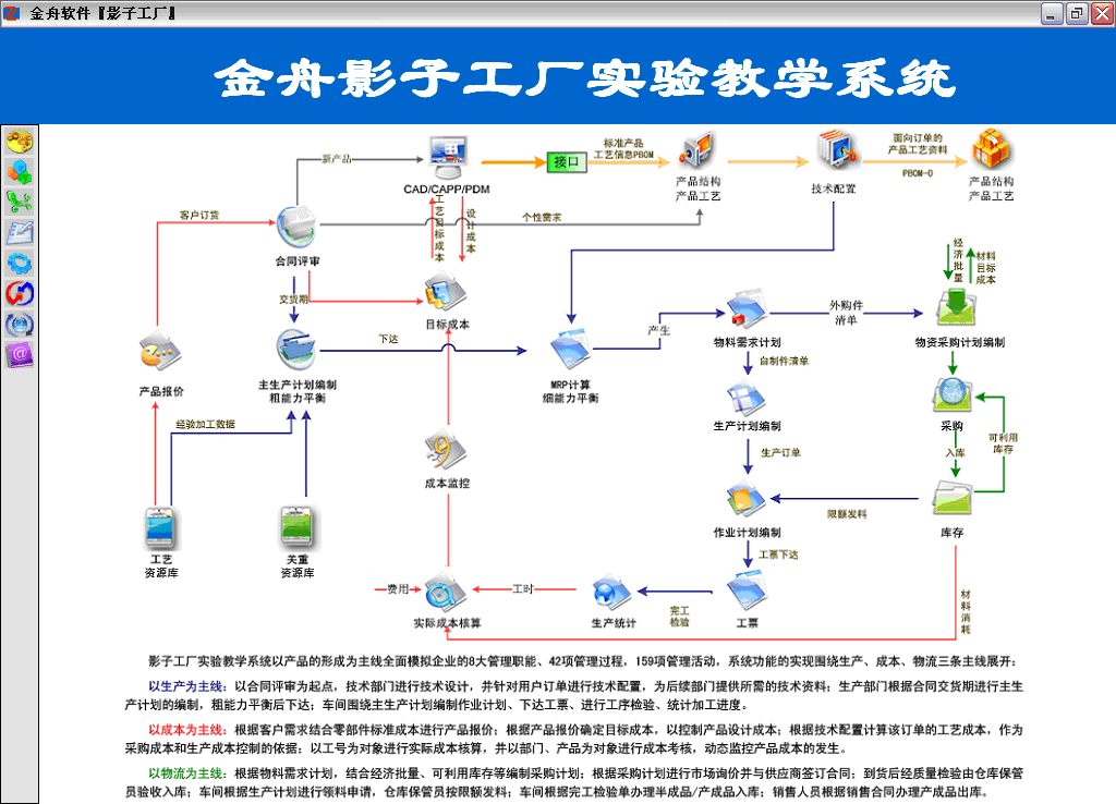 金舟影子工廠實驗教學系統(tǒng)軟件體現(xiàn)了現(xiàn)代企業(yè)管理思想,能夠幫助在校學生加深對制造業(yè)的業(yè)務(wù)流程、管理職能、管理過程和管理活動的認識,有助于提高學生的實踐動手技能,鍛煉其發(fā)現(xiàn)問題、分析問題、解決問題的能力,對輔助高校經(jīng)管類等專業(yè)的教學具有很高的實用價值。